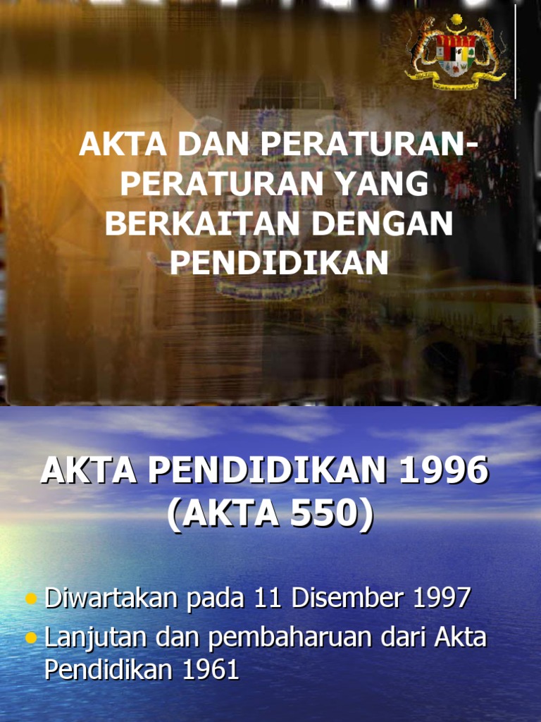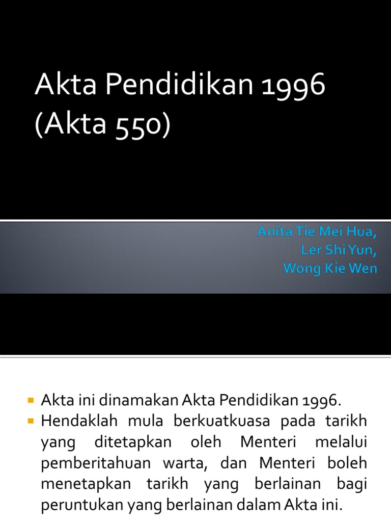 Akta Pendidikan 1996 (Akta 550) - Apakah kandungan yang terdapat dalam akta pendidikan 1996 ??. Sesebuah negara berminat terhadap pendidikan? Pengenalan kandungan akta pendidikan 1996. Dalam akta ini melainkan jika konteksnya. 16 bahagian yang terkandung dalam akta pendidikan 1996 ialah bahagian 1 yang mengandungi tajuk ringkas dengan nama akta iaitu. Di malaysia, akta bermaksud sebarang.