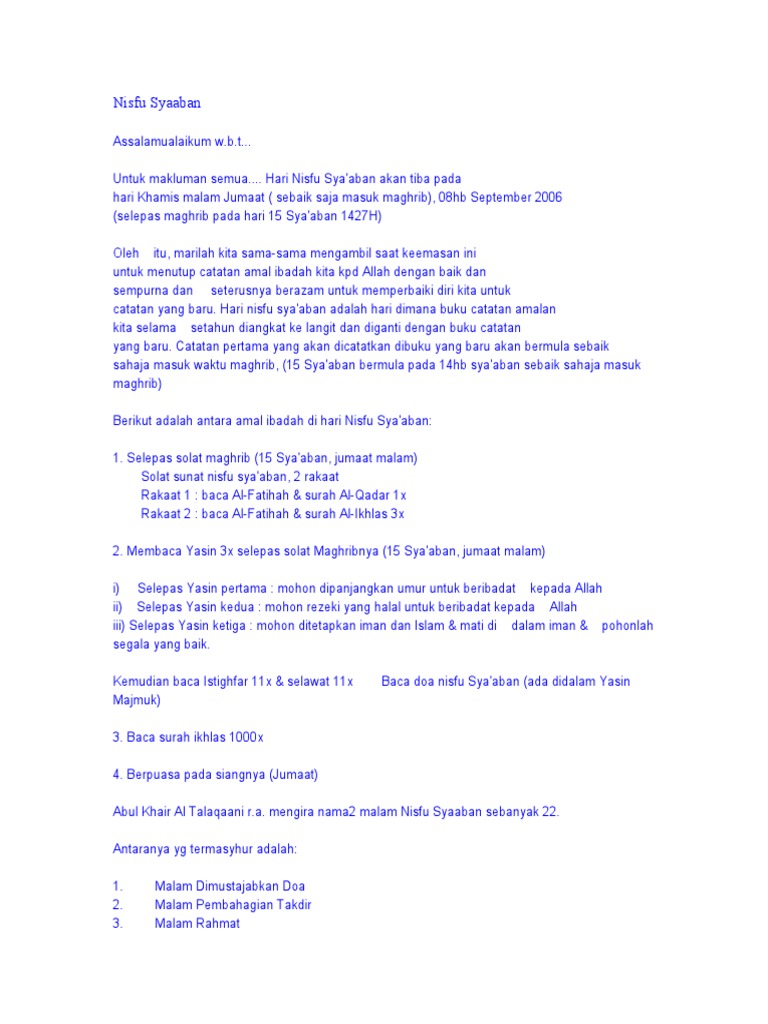 Amalan yang dikerjakan dalam malam nisfu sya'ban dan bulan sya'ban. Sholat maghrib berjamaah dan membaca zikir setelah sholat. Akan tetapi, malam nisfu sya'ban sendiri terdapat berbagai pendapat di dalamnya yang mengganggap benar dan tidak. Doa malam nisfu sya ban baca yasin 3x nisfu syaban 2021 ust h sardi mustaupa mm. Pd malam nisfu abah akan mengadakan nisfu syaban dan rasulan utk semua jamaahnya dan sekalian arwah2 keluarganya wasalaam.