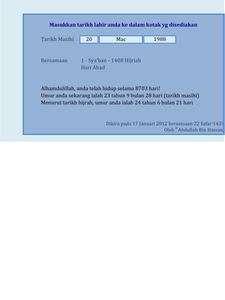 Trtansformasi Tarikh Masihhi Ke Hijrah from imgv2-1-f.scribdassets.com Tarikh malam nisfu syaaban 2021 1442h malaysia|bilakah tarikh malam nisfu syaaban 2021/ 1442h di malaysia? Hi everyone, here's wishing all muslims : Dalam takwim hijrah, terdapat 12 bulan. Untuk memudahkan anda, kami juga menyertakan tarikh tahun masihi disebelah tarikh hijrah. Cara tukar tarikh masihi ke hijrah. هِجْرَة) adalah perpindahan/migrasi dari nabi muhammad dan pengikutnya dari mekkah ke madinah pada bulan juni tahun 622. Kalendar 2011 (masihi & hijrah). 8 mei itulah tarikh yang seakan merentap jantung mama sayang.